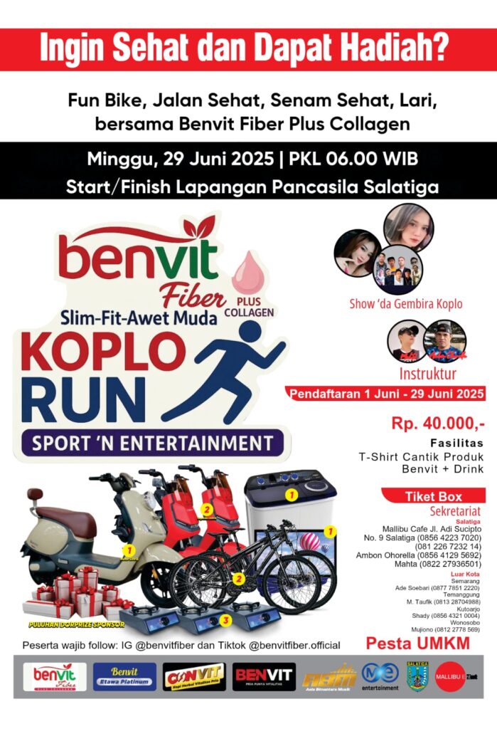 Sukabumi Berita | Warga Salatiga, Solo Raya, dan seluruh Jawa Tengah bersiaplah! Event paling dinanti tahun ini hadir perdana: KOPLO RUN: Sport ‘N Entertainment persembahan dari Benvit Fiber Plus Collagen, akan digelar di Lapangan Pancasila, Salatiga pada Minggu, 29 Juni 2025 mulai pukul 06.00 WIB.